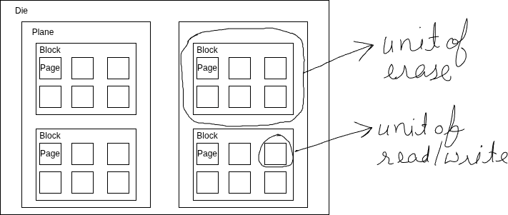 - Block: Smallest erase unit (multiple pages, often MBs)